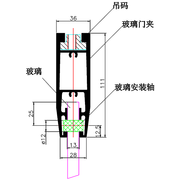 该玻璃门夹型材用于10-12厘玻璃推拉门、隔断门的吊装,滑车通过吊片与门夹连接,玻璃上打孔并通过尼龙销与门夹连接,下门夹可安装地锁用于玻璃门的固定;吊装门夹强度高、表面工艺美观漂亮,适于大型商场、展厅的玻璃隔断门使用。