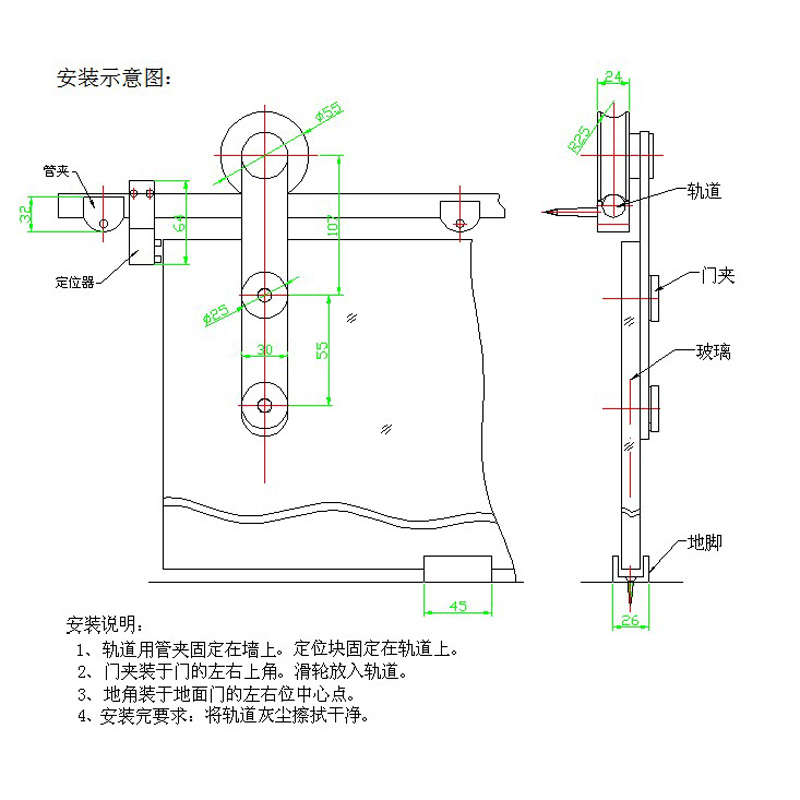 滑车车体材质为304不锈钢,表面工艺为砂光或亮光,滑轮直径为∮52;玻璃开孔尺寸为∮26、两孔中心距为∮55;与∮25的304不锈钢圆管配套使用,玻璃厚度为10mm/12mm.适用于办公室、商场、超市等玻璃或木质推拉门使用。具有滑动平稳、美观漂亮等优点。双滑车承载能力150公斤。
