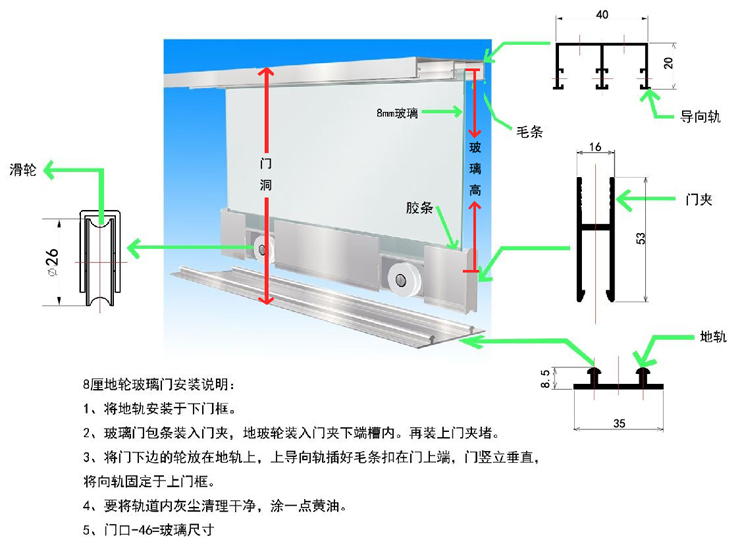 8厘地轮玻璃门滑车采用下承重,与8厘地轮玻璃门上下轨、8厘地轮玻璃门夹配套使用。双车承重40公斤。