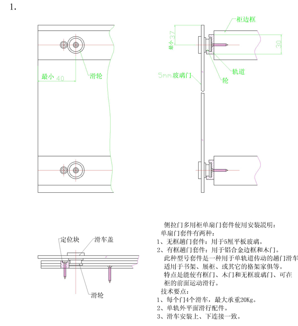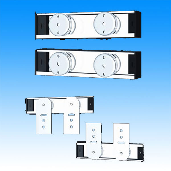 - 产品简介:侧拉式有框玻璃门滑车套件,与侧拉式玻璃门滑轨配套使用,适用于展柜、橱柜等侧拉式有框玻璃门场合。每扇玻璃门由上下各两只滑车固定。安装方便、造型美观。双滑车承重20公斤。